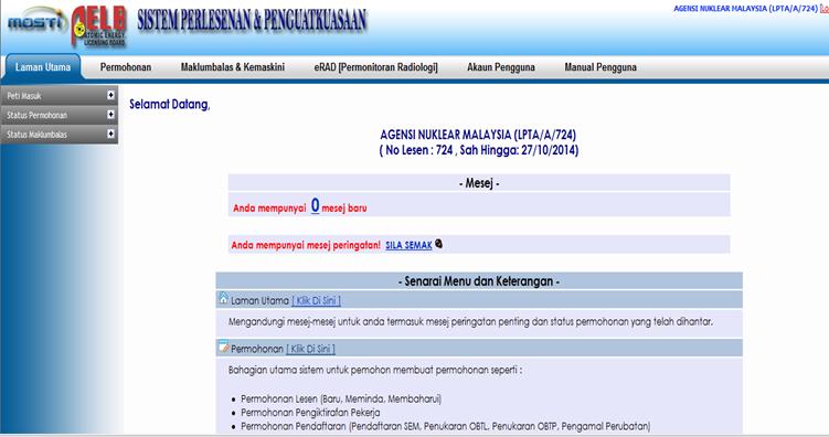 senarai menu dan keterangan untuk makluman pengguna.