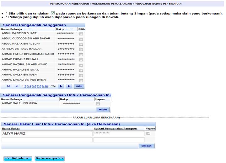 Skrin pemilihan pengendali senggara yang terlibat