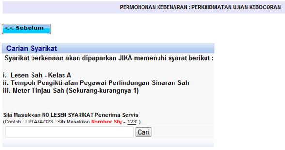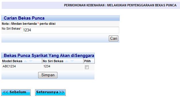 Skrin carian syarikat penerima servis senggara bekas