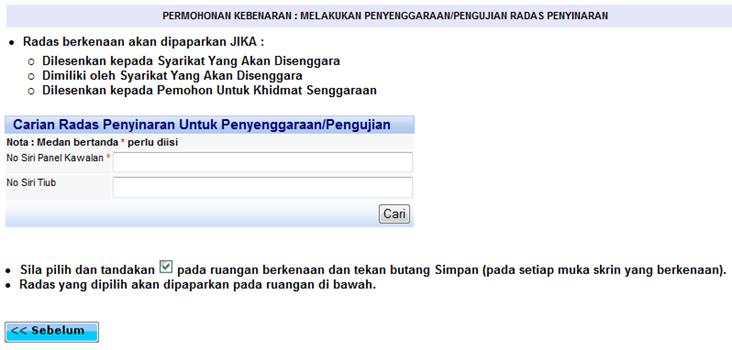 Skrin carian radas yang terlibat dengan servis