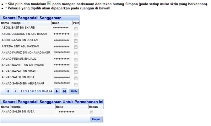 Skrin paparan pekerja yang dipilih