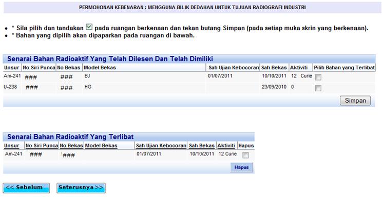 Skrin bahan yang terlibat untuk permohonan ini