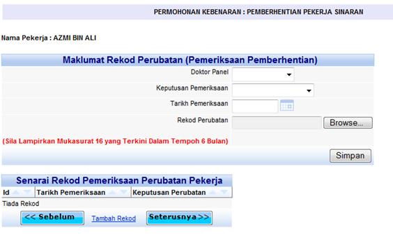 Skrin rekod pemeriksaan perubatan untuk pemberhentian