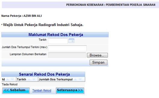 Skrin rekod dos pekerja