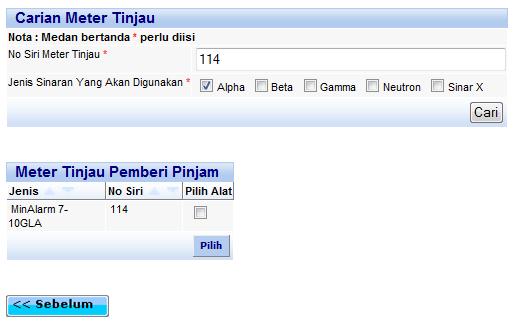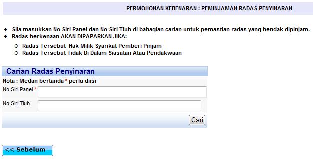 Skrin carian radas yang hendak dipinjam