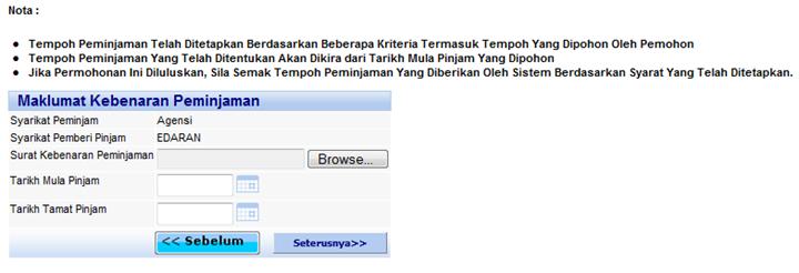 Skrin maklumat yang diperlukan untuk peminjaman