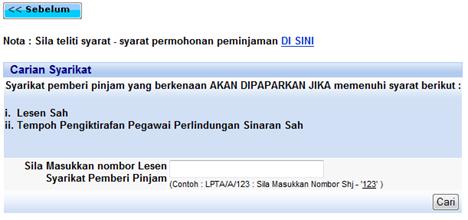 Skrin carian syarikat pemberi pinjam