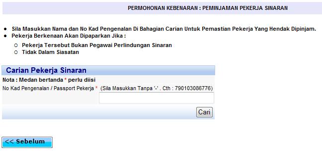 Skrin carian pekerja yang hendak dipinjam