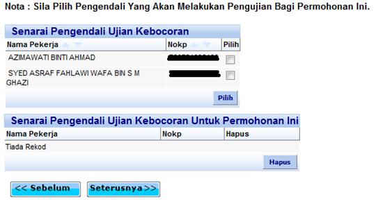 Skrin pemilihan pengendali ujian kebocoran yang