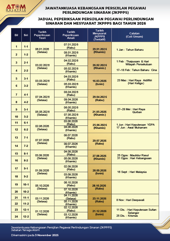 Jabatan Tenaga Atom sedang menjalankan kajian kepuasan pelanggan bagi mengukur tahap kualiti penyampaian perkhidmatan yang telah diberikan dan maklumbalas yang diberikan akan digunakan untuk mempertingkatkan lagi kualiti perkhidmatan yang disediakan. Soal selidik ini boleh dicapai melalui pautan berikut https://forms.gle/jtRpymW6EKchHhMh6/